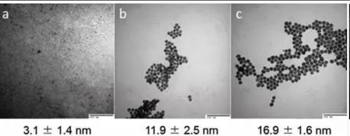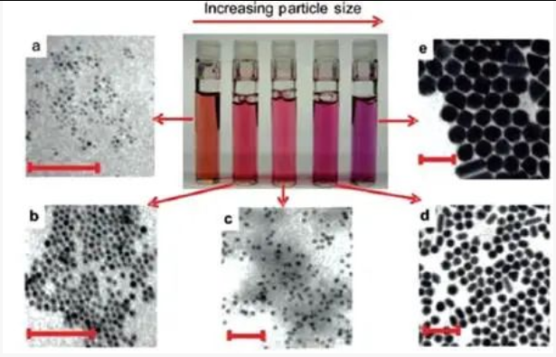 第二种办法则需要借助大型仪器投射电子显微镜(TEM),这种办法不仅能直接观察到金纳米颗粒的存在,还能确定金纳米颗粒的大小[6]。实际上,金纳米颗粒的大小和加入还原剂柠檬酸钠的量有关系,在保持氯金酸加量不变的前提下,柠檬酸钠加入的越多,所形成的金纳米颗粒越小。柠檬酸钠加入的越少,所形成的金纳米颗粒越大。小编这里的理解是,因为体系中加入氯金酸的量是固定的,越多的还原剂可以形成更多的种子金,产生更多的金纳米颗粒中心(“山头”),这样最后形成的金纳米颗粒大小也就越小。而越少的金纳米颗粒中心(“山头”)就能够吸引更多的金原子,产生更大的金纳米颗粒。