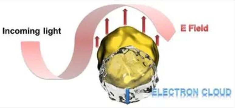 不同颗粒大小的胶体金都带有颜色,这个颜色的产生是由于胶体金吸收了可见光中的一部分造成的。我们把金纳米颗粒想象成下图中的黄色球体,而金纳米颗粒中的电子则位于球体的表面。金纳米颗粒的大小远小于可见光的波长(400-760 nm),这些电子在入射光产生的电场的影响下朝着相反的反向进行振动。当光线照射到金纳米颗粒表面时,如果入射光的频率和金属纳米颗粒表面电子震荡的频率相同时,就会产生共振。金纳米颗粒对入射光产生很强的吸收作用,这种现象被称为局域表面等离子体共振(LSPR,localized Surface Plasmon Resonance)[7]。等离子体就是我们刚刚提到的在金属表面的电子。