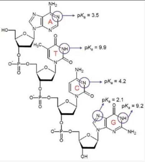 在具体讲述连接办法之前,我们先回顾下DNA的基本性质。下图显示的是5’- ATGC-3’的寡核苷酸,即使DNA上未进行任何修饰,金纳米颗粒AuNP也会对其产生强烈的吸附作用,吸附作用从强到弱分别为A> C> G> T >>磷酸。碱基在PH5到8之间呈现电中性,腺嘌呤A和胞嘧啶C在PH 3.5和4.2时会获得质子从而带一个正电,鸟嘌呤G在PH 2.1时才发生质子化,这都需要相当低的PH才会发生,而这样的PH在常规实验中是不会遇到的。通常情况下,DNA是带大量负电荷的聚合物[10]。