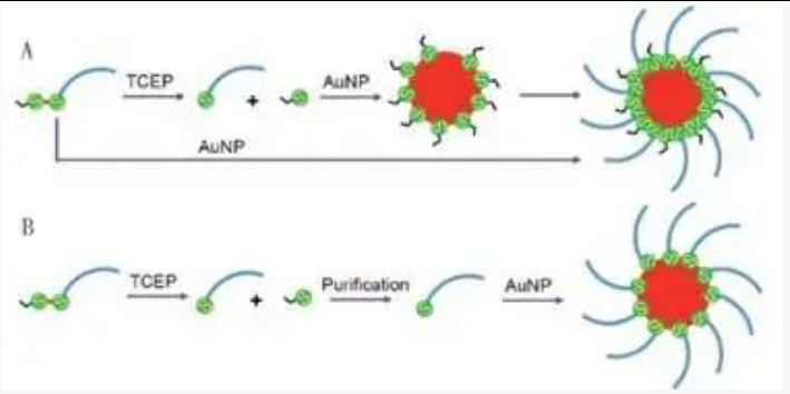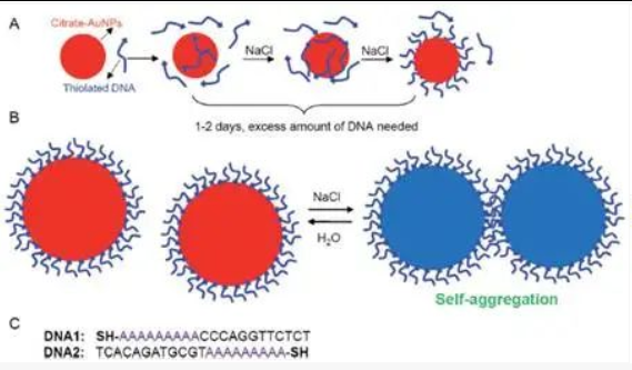 如果只是借助AuNP对DNA的吸附,通常情况下,会在DNA序列的一端带有PolyA的结构,PolyA负责与AuNPs的结合,其余部分序列参与杂交过程。大部分情况下,AuNP与DNA的连接过程是通过AuNP的DNA上巯基之间的金硫键来完成的。由于DNA和AuNPs都带负电荷,会受到金纳米颗粒的负电和DNA所带有的负电的排斥力影响,导致两者很难形成金硫键。