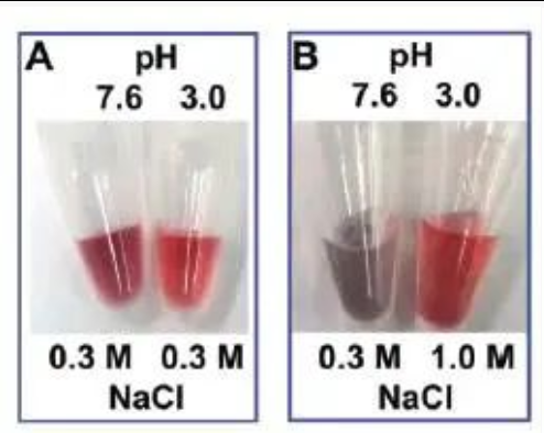 该方法的基础是DNA碱基的质子化。即,腺嘌呤和胞嘧啶可以在pH 3下被质子化。质子化的碱基减少DNA和AuNP之间的排斥,更重要的是,减少AuNP上DNA链之间的排斥。因此,如果DNA富含鸟嘌呤和胸腺嘧啶,则这种低pH值的方法不太可能奏效。