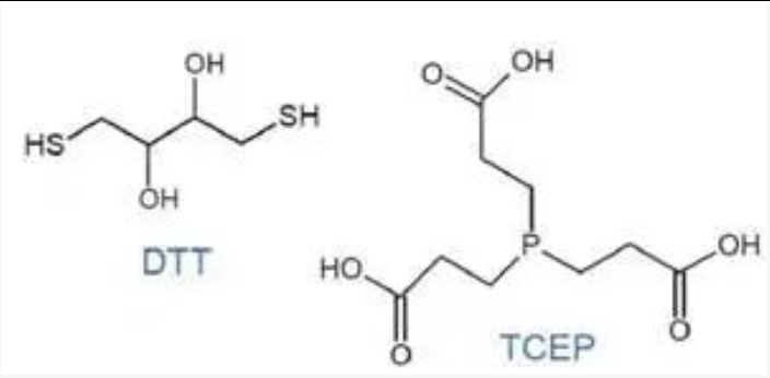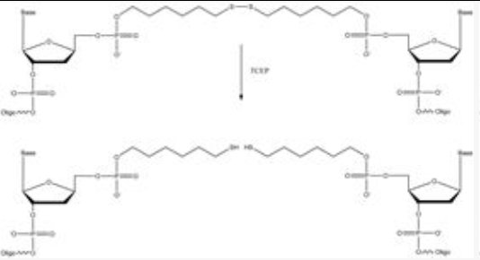 生工提供商品化的巯基修饰DNA包含两种形式,游离硫醇(free thiol,修饰代码为SH CN)和二硫化物(disulfide,修饰代码为HS-SH CN)。游离硫醇修饰的DNA容易形成分子间二硫键导致二聚体。二硫化物修饰的DNA是巯基被保护的结构。为了得到裸露的巯基,在临用前需要使用还原剂DTT或者TCEP进行还原处理。
