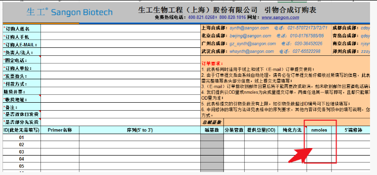 如果在需要订购一定摩尔数的Oligo时,如果不方便换算成OD,那么也可以直接在nmoles中进行填写。