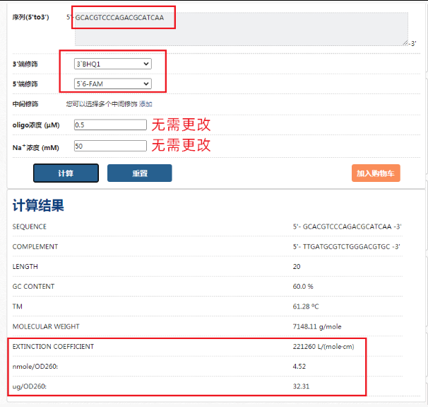 可以在这里计算:https://www.sangon.com/baseCalculator,将序列和修饰输入进去,点击计算,就能得到所需要的结果: