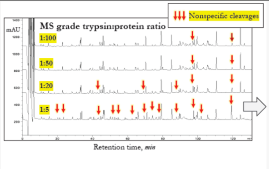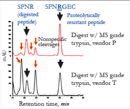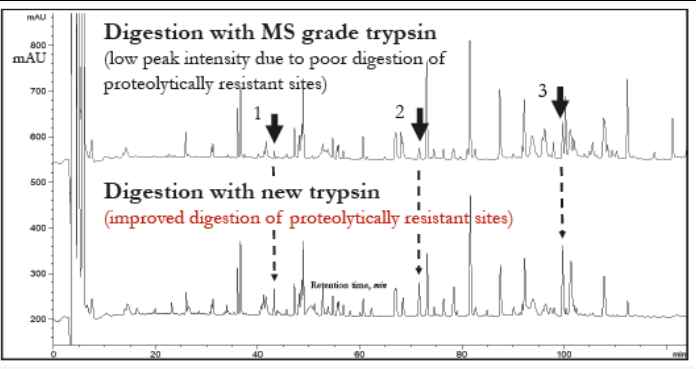 MS级胰蛋白酶的蛋白水解效率中等。即便胰蛋白酶与蛋白的比例为1:10,蛋白水解抗性位点的消化也不完全。