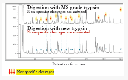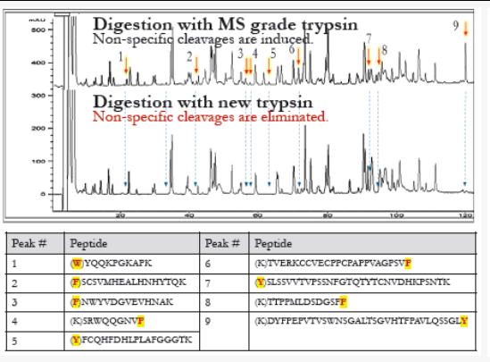 在蛋白质谱领域中,胰蛋白酶最受欢迎,这是因为胰蛋白酶性能极佳、蛋白中胰蛋白酶裂解位点分布最佳且所得肽段带强电荷。但是,现有质谱级胰蛋白酶常常无法提供所需的性能。我们发现,这些胰蛋白酶具有非特异性裂解活性,若大量使用,非特异性裂解活性尤为显著。蛋白消化期间自体水解和蛋白水解活性不足所致的蛋白水解抗性位点消化不完全也属于胰蛋白酶的常见缺点。此外,这些胰蛋白酶易受动物源性蛋白污染,且批间活性变异性显著。本文介绍了可解决这些缺点的新胰蛋白酶。新胰蛋白酶尤其适用于生物治疗蛋白的表征。