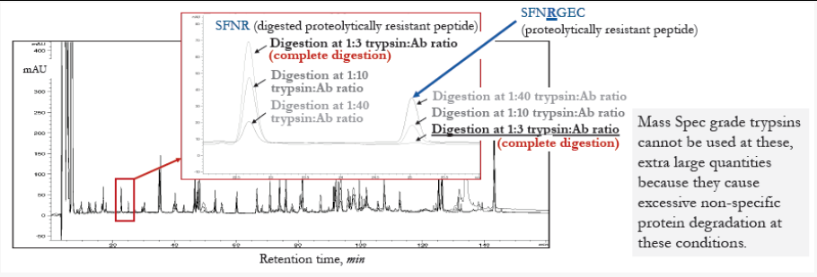 增加胰蛋白酶:Ab比例并过夜消化帕尼单抗抗体,然后进行RP-HPLC-UV(Agilent 1200)分析。