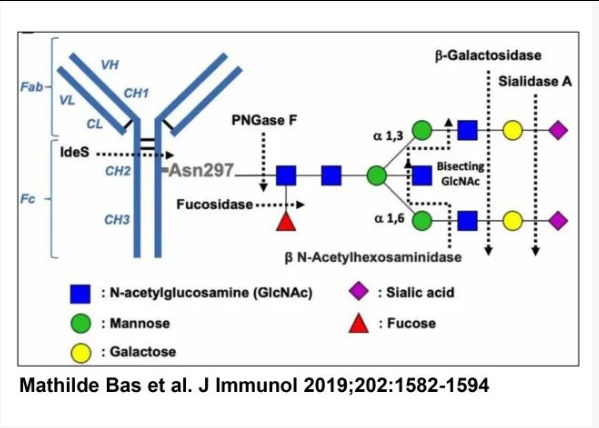 N297位点发生N-糖基化的IgG1分子示意图。糖基可以通过葡萄糖苷酶和抗体工程化方法进行修饰。
