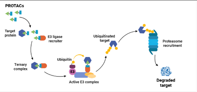 值得注意的是,PROTAC可以在靶蛋白泛素化后释放,所以其在此过程中可被循环利用。因此,相对少量的PROTAC可催化大量靶蛋白的降解。