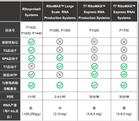 确定最适合客户的体外转录系统非常重要,Promega的体外转录系统的特点比较见下表: