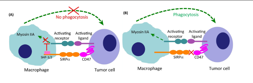 SIRPα/CD47 阻断可通过两种方式促进对肿瘤细胞的吞噬作用:如下图(B) 所示。