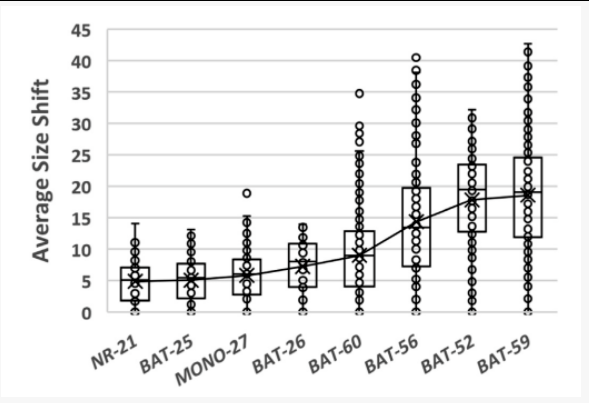 图4.使用LMR MSI panel的微卫星不稳定性高/缺陷错配修复肿瘤中标志物的大小变化。显示了所有微卫星不稳定性高/缺陷错配修复肿瘤的每个长单核苷酸重复标志物(平均值用X表示)的大小变化。每个点都是一个值,可以表示多个数据点。