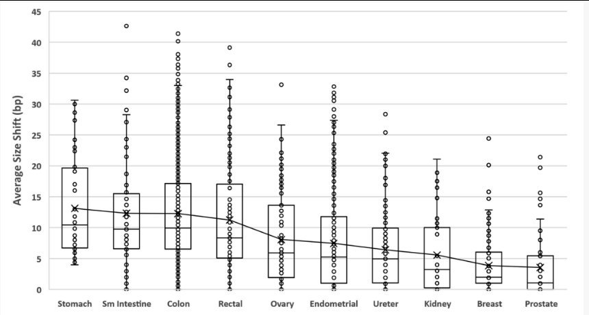 不同癌症类型的片段偏移程度存在差异:胃肠道肿瘤的平均偏移最大(12.2 bp),乳腺(3.9 bp)和前列腺(3.5 bp)肿瘤最小(图5)。