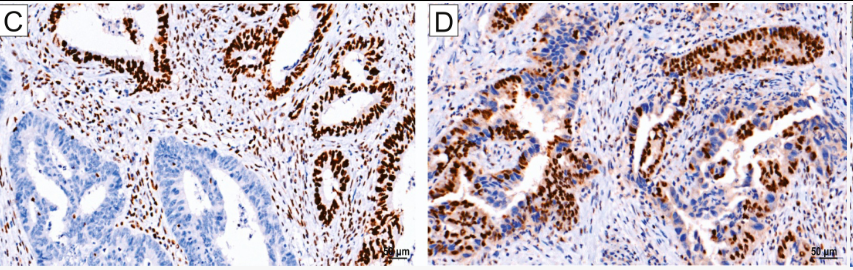 研究人员收集了1394例CRC和242例EC样本,通过MMR蛋白的免疫组织化学(IHC)检测,发现有78个样本存在异质性表达,其中49个来自CRC,29个来自EC。基于现有的IHC解释标准,将66个异质性表达的样本判定为pMMR,12个判定为dMMR。根据MMR蛋白表达的分布特征,有两种不同的异质性表达模式:一种是克隆异质性,即肿瘤细胞中的局部或多焦点表达如图C;另一种是嵌合异质性,即恶性腺体内的嵌合状表达如图D。