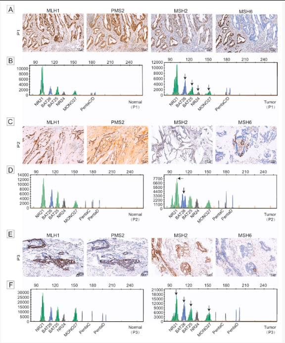 进一步对6例具有克隆异质性表达的MMR蛋白的样本进行了PCR-CE,发现在3个CRC病例显示MSH6蛋白的孤立小灶性表达(如下图A、C、E),阳性肿瘤细胞数小于15%。根据现有的IHC解释标准这三种情况应被视为pMMR。然而,PCR-CE结果显示它们是MSI-H(如下图B,D,F),