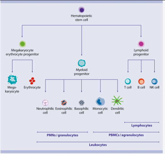 白细胞的各种亚型在免疫应答中发挥重要作用。血液的所有细胞成分都来自造血干细胞(HSCs)。这些多能干细胞位于骨髓,分裂产生潜能较有限的祖细胞:普通淋巴祖细胞和普通髓系祖细胞。常见的淋巴祖细胞可生成T、B淋巴细胞和自然杀伤细胞(NK),而常见的骨髓祖细胞可生成单核细胞、树突状细胞和粒细胞(包括中性粒细胞、嗜碱性粒细胞和嗜酸性粒细胞)。最后,产生红细胞和血小板的巨核细胞产生于它们各自的共同祖细胞。