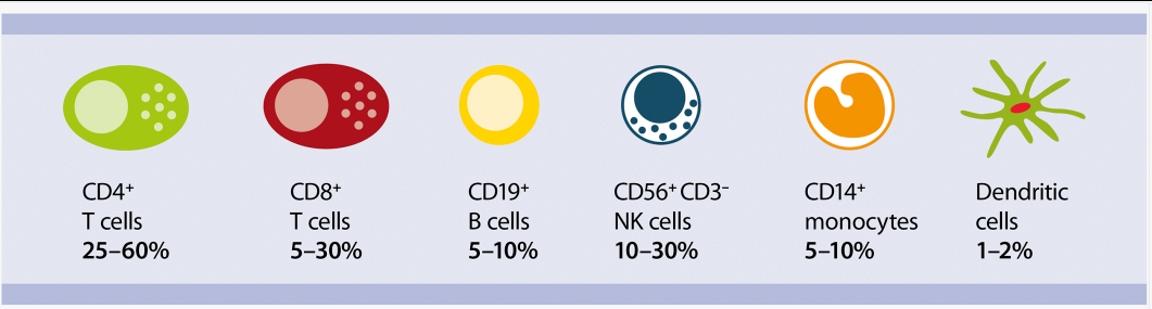 pbmc包括淋巴细胞(T细胞、B细胞和NK细胞)、单核细胞和树突状细胞。除其他特征外,T淋巴细胞和B淋巴细胞的成熟位置和抗原受体是不同的。T细胞在胸腺中成熟并表达T细胞受体TCR,而B细胞在骨髓中成熟并携带B细胞受体BCR。T细胞表达CD3,并进一步分为表达CD4的辅助性T细胞(TH)和表达CD8的细胞毒性T细胞(TC)。B细胞以表达CD19为特征,通过产生大量抗原特异性抗体来中和细菌和病毒等外来物,并对其进行标记以使其易于被其他免疫细胞识别,从而对病原体产生应答。NK细胞为CD56+CD3-,与T细胞和B细胞来源于相同的祖细胞,但缺乏抗原受体。最后,单核细胞是最大的pbmc类型,表达CD14。它们在血液中循环13天,然后通常进入全身组织,并可以分化成巨噬细胞和髓系树突状细胞。