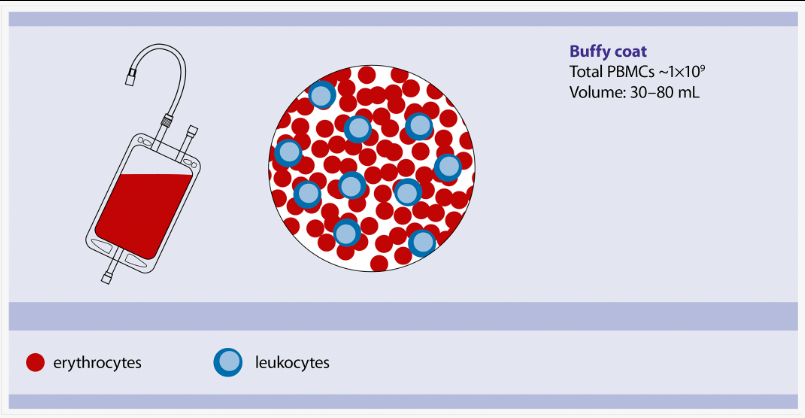 Buffy coat是血液样本中除去红细胞和血浆后含有白细胞的部分。献血后,将450ml血袋离心,得到3个馏分:i)血浆(上馏分),ii)Buffy coat(中馏分),ii)红细胞(下馏分)。一般来说,血库只对血浆和红细胞感兴趣。因此,这些部分是从血袋中提取出来的。剩下的物质(Buffy coat)由浓缩的白细胞组成,红细胞和粒细胞数量减少,体积从30到80毫升不等。Buffy coat是常见的pbmc来源,容易获得且相对便宜。