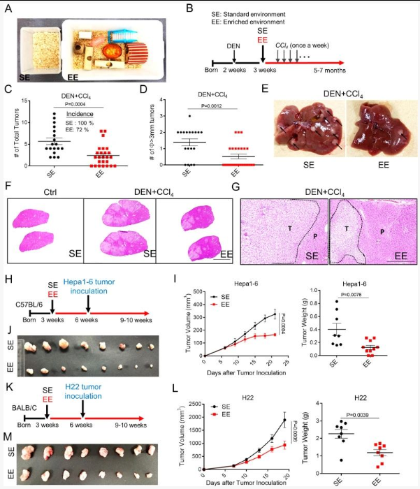 1、100% 的SE 小鼠在 5 个月大时发生肝肿瘤;72% 的 EE 小鼠发展为肝脏肿瘤,肿瘤数量和大小减少;