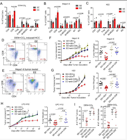 1、与 SE 小鼠相比,EE 小鼠中DEN + CCl4肿瘤 CD8 + T 细胞显著增加,而 M-MDSC、G-MDSC 和 M2 样 TAM 显著减少;