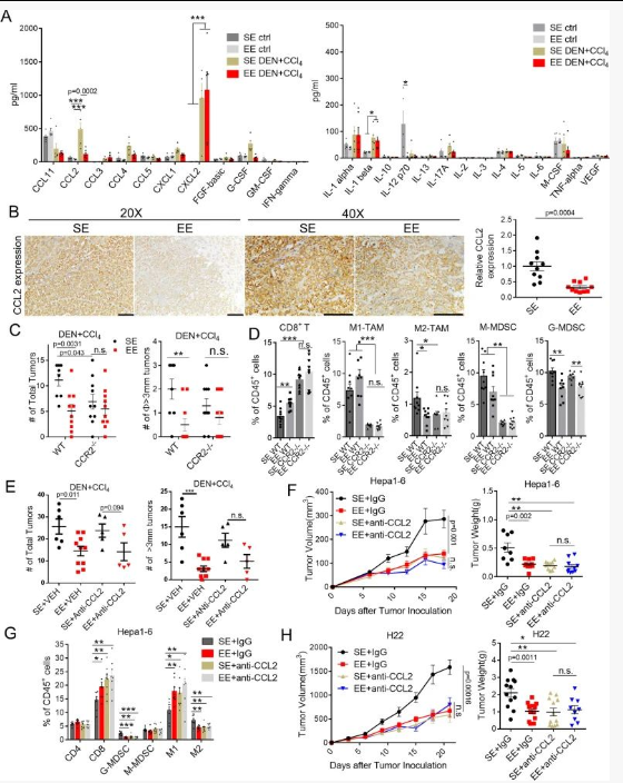 4、敲除肿瘤来源的CCL2或宿主来源的CCL2可以抑制肿瘤生长,并部分降低EE的抗肿瘤作用。相反,阻断肿瘤来源和宿主来源的 CCL2 信号传导消除了 EE 的保护功能。