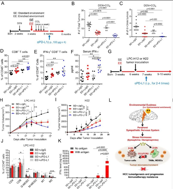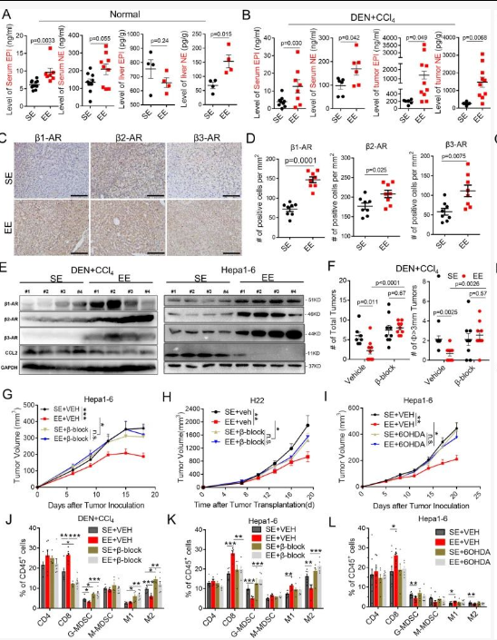 作者通过颠覆 β-ARs/CCL2 介导的免疫抑制作用,建立了环境正常应激与肝癌发生和进展之间的因果关系。证明了由于 CD8 + T 细胞依赖性肿瘤对照,与 SE 相比,生活在 EE 中的小鼠对致癌物诱导的肝肿瘤和可移植的同基因肝肿瘤表现出更好的保护作用。环境正应力激活外周 SNS,适度升高血浆 NE 和 EPI,并增强配体和受体水平的 β-ARs 信号传导。肿瘤细胞和免疫细胞中β-ARs的激活直接沉默了CCL2的表达,导致免疫抑制性肿瘤微环境和检查点阻断难治性肿瘤对抗PD-L1治疗的反应显著增强。