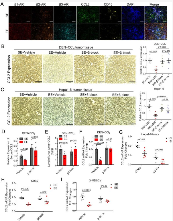 结果提示: β-ARs 作为肿瘤调节的外周神经-内分泌-免疫通路对肿瘤衍生的和宿主 CCL2 表达的交感神经调节。
