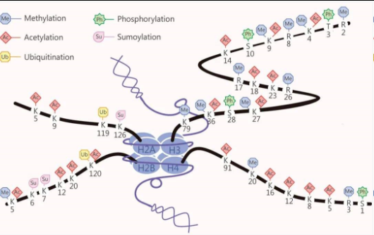 组蛋白的主要修饰类型有:乙酰化、甲基化、磷酸化、泛素化、SUMO化和ADP-核糖化,其中最常见的修饰形式是组蛋白甲基化和乙酰化。组蛋白甲基化和乙酰化状态是否正常通常都会影响各类疾病发生,特别是在肿瘤、免疫等疾病中。
