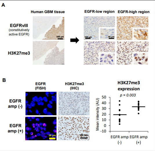 激活的EGFR突变体Ⅲ( EGFRvIII )与人GBM组织中H3K27me3的表达密切相关, 而且作者进一步发现EGFR扩增与人类GBM病例H3K27me3表达也呈正相关,提示组蛋白甲基化不一定依赖于突变的具体类型,而是取决于EGFR的激活状态。