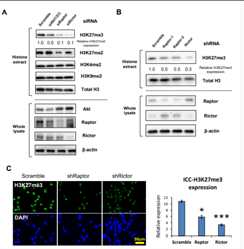 2、在GBM细胞中,两个mTOR 复合物会调控H3K27me3水平