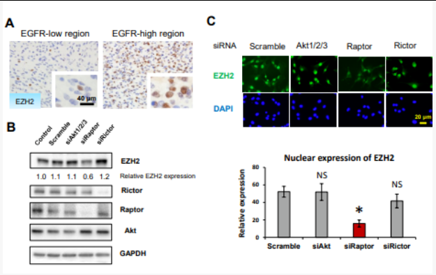 C. 针对Akt、Raptor或Rictor的siRNA的U87 - EGFRvIII细胞定量免疫荧光染色EZH2 (绿色);