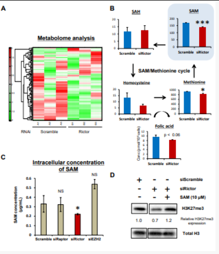 综合代谢组学分析显示mTORC2抑制导致中间代谢产物发生显著变化,其中组蛋白甲基化的底物S-腺苷蛋氨酸( SAM )的胞内浓度在Rictor敲除的U87 - EGFRvIII细胞中显著降低。