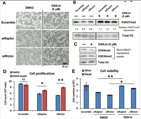 通过对针对Paptor、Rictor siRNA的以及同时用GSKJ4处理GBM细胞,测GBM细胞的增值以及死亡数等,结果表明:mTOR复合物使H3K27me3增加,可加速GBM细胞增殖。