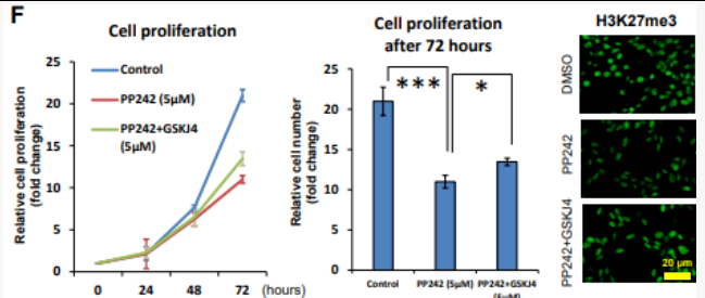 F. PP242 ( 5uM )或PP242 ( 5uM )与GSKJ4 ( 5uM )联合处理U87 - EGFRvIII细胞,在指定时间点测细胞增殖。在相同条件下处理72小时的U87 - EGFRvIII细胞中H3K27me3表达的免疫细胞化学图像。
