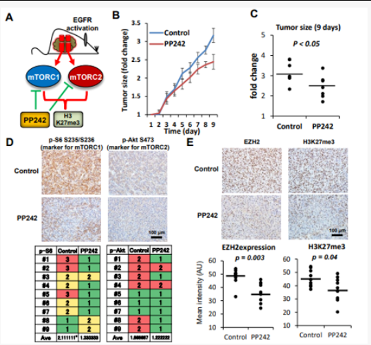 通过建立一个移植的小鼠肿瘤模型,用一种双重mTOR抑制剂( PP242 )进行处理,发现PP242治疗有效地抑制了GBM肿瘤在体内的生长,mTOR标记物、H3K27me3和EZH2表达显著降低。