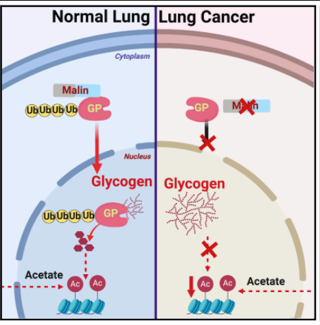 过表达Malin的A549细胞表现为核糖原裂解组蛋白乙酰化增加,直接导致表观遗传学改变,200个基因/位点在Malin过表达后发生变化,其中198个基因/位点上调。因此,Malin可促进糖原分解,促进丙酮酸的产生以及组蛋白乙酰化。