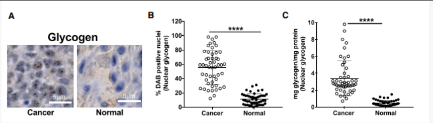 NSCLC组织中的糖原含量要远远高于肿瘤远端良性组织中的糖原量,高大约10~100倍,而且良性组织中含有可测量的糖源,表明糖原代谢是一种正常细胞中的生理事件。