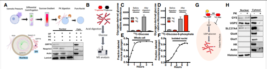 A.13C6 -葡萄糖喂养小鼠产生肝脏13C-糖原示意图;B. 以13C-糖原为底物,用纯化的核裂解液孵育,追踪其代谢过程;