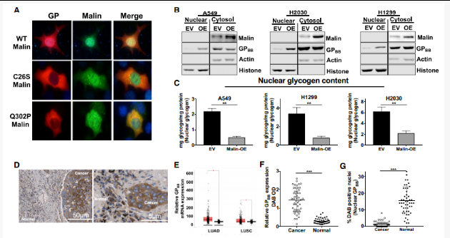Malin和GPBB在HEK293细胞中的共表达导致GPBB从细胞质转移到细胞核,而Malin过表达细胞系中的核糖原减少70%;肺癌组织中GPBB大部分分布在胞质中,正常组织中,GPBB大部分分布在胞核中。