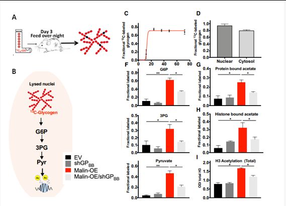 图7. 在体内Malin调节核糖原代谢和组蛋白乙酰化