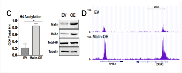 A、B. 对以上图5C中处理样本的乙酰化H4赖氨酸残基和H3赖氨酸残基ELISA;C. 组蛋白H4乙酰化的ELISA和免疫印迹定量检测;D. EV和Malin过表达中H4Ac的ChIP-seq结果图。