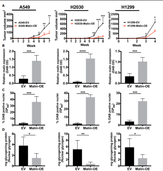 在3种非小细胞肺癌细胞系中Malin过表达促进了GPBB的核转位,促进核糖原的分解,增加了组蛋白H3和H4的乙酰化,显着降低了肿瘤的生长,因此增加Malin的表达丰度,会抑制非小细胞肺癌细胞的生长。