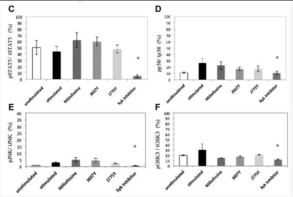 RBL-2H3 cells were incubated with 1 μM, 5 μM, or 25 μM compound for 2 h and then stimulated with dinitrophenyl– human serum albumin for 15 min. Cells were lysed, and a specific amount of lysate was tested in the pAkt/tAkt (A) and pERK/tERK (B) MSD plates. MSD assays were performed using the Syk inhibitor as a positive control. (C) pSTAT5/ tSTAT5, (D) pp38/tp38,(E) pJNK/ tJNK, and (F) pGSK3β/tGSK3β.
