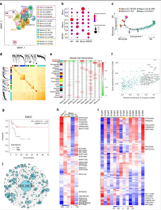 作者进一步进行了髓细胞的无监督聚类。鉴定出14个细胞簇,包括9个单核细胞/巨噬细胞簇和5个DC细胞簇(图5A)。Mono-C1-VCAN显示出很强的单核细胞特征(图5B),为了进一步了解细胞转变,作者使用了Monocle(一种无监督的推理方法)来构建细胞转化的潜在发展轨迹。数据显示单核细胞(Mono-C1-VCAN),M1(Macro-C1-IL6)和M2(Macro-C3-CSF1)位于分支的末端,Macro-C2-IL1RN位于中间(图5C)。接下来,作者使用WGCNA对单核细胞/巨噬细胞进行加权相关网络分析。有趣的是,作者发现Turquoise模块与单核细胞簇Mono-C1-VCAN和Mono-C2-IL1B正相关,而与M2簇Macro-C3-CSF1和MDSC簇MDSC-C1-C1QC,MDSC负相关-C2-APOE(图5D-E)。作者进一步分析了该模块中的基因及其与Mono-C1-VCAN的关联(图5F)以选择最相关的前50个基因,以形成一个集合。这一特征与ESCC存活率的高可能性密切相关(图5G),以及宫颈鳞状细胞癌和肺鳞状细胞癌也出现类似现象,这表明该标记物可作为ESCC和其他组织中鳞状细胞癌的预后生物标志物。