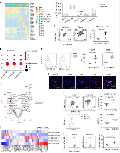 五个DC簇具有高表达水平的CLEC9A,CD1C,FCER1A,LAMP3和CLEC4C,包括常规cDC1(DC-C1-CLEC9A),cDC2(DC-C2-CLEC10A),单核细胞衍生DC(DC-C4-FCER1A) ),LAMP3 + DC(DC-C3-LAMP3)和pDC(DC-C5-CLEC4C)(图6A)。与邻近组织相比,DC-C3-LAMP3富含肿瘤(图6B)。比较了DC的激活和迁移分数,发现LAMP3 + DC与其他DC子集相比具有最高的活性和迁移能力,还发现LAMP3 + DCs丰富了致耐受性的特征(图6C)。LAMP3 + DCs表达了许多调节分子,例如IDO1,EBI3,CD274和IL10(图 6D)。在进行路径富集分析时,发现LAMP3 + DC中上调的基因在细胞因子介导的信号转导,DC细胞分化,白细胞激活,膜运输,抗原加工和呈递的路径中富集(补充图10A),该DC子集支持多功能。