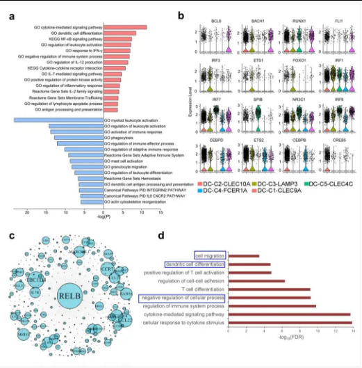 作者通过流式细胞仪验证了LAMP3 + DC。数据显示,与LAMP3-DC相比,LAMP3 + DC的CD83,CCR7和PDL1的表达显着更高(图 6E-F),表明LAMP3 + DCs具有成熟、迁移和调控能力。多色免疫组化染色也证实了肿瘤组织中CD11C + LAMP3 + PDL1 + IDO + DCs的存在(图6G)。有趣的是作者发现IFNγ和LPS刺激诱导DCs表达PDL1和IDO(图6H),并在与CD4 + CD45RA + naïve T细胞共培养时诱导FOXP3表达能力增强(图6I)。提示IFNγ和LPS可诱导树突状细胞产生耐受性。此外,SCENIC分析显示DC亚群可以通过不同的转录因子组来区分(图6J)。LAMP3 + DCs表现出较高的RELB、IRF1、FOXO1和ETS1水平;CEBPD、ETS2、CEBPB、CREB5在cDC2中表达上调。BCL6、BACH1、FLI1和RUNX1在cDC1中高表达,而高水平的SPIB、IRF7和NR3C1与pDCs相关(图6J和补充图10B)。因此,作者进行了网络分析,以通过Metascape鉴定RELB下游基因。数据显示,这些基因与细胞迁移,DC分化和细胞过程的负调控有关(补充图10C-D)。这些结果表明RELB在调节tDC发展中具有重要作用。
