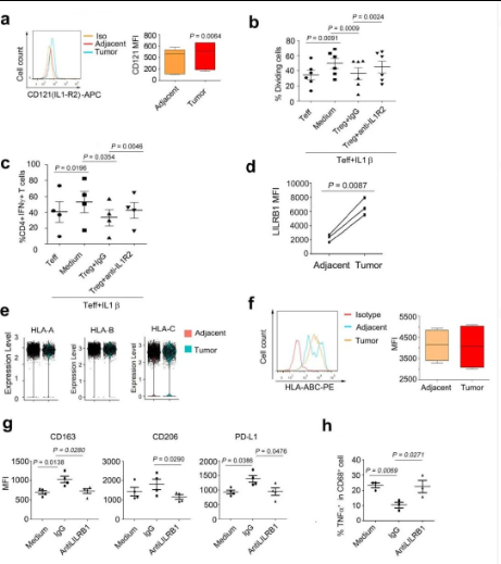 结果发现巨噬细胞和Treg之间的TNF-TNFSF1B,CCL4-CCR8和IL-1β-IL1R2相互作用具有较高的相互作用评分,并且Treg在肿瘤中表达了高水平的TNFSF1B,CCR8和IL1R2(图7A-C)。首先,通过流式细胞术分析了食管鳞癌和邻近组织的IL1R2表达,发现从肿瘤分离的Tregs中IL1R2表达高于邻近组织(补充图11A)。然后,多色IHC还验证了Tregs中的IL1R2表达(图7D)。第三,体外共培养和抗体阻断试验表明,IL1R2对于Treg抑制抑制效应细胞T的IL-1β依赖性激活(例如增殖和IFNγ表达)是必需的(图7E-F,补充图11B-C)。