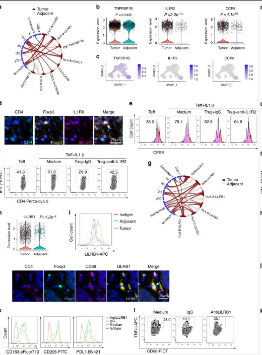 作者还预测了Tregs中的MHC和巨噬细胞中的LILRB1之间的相互作用(图7G)。MHC受体LILRB1是髓样细胞活化的负调节剂,是M2抑制状态的启动子。MHC-LILRB1相互作用抑制巨噬细胞,是癌症免疫治疗的靶。首先通过scRNA-seq分析了巨噬细胞中LILRB1的表达,并通过FACS对其进行了进一步验证。发现,与邻近组织相比,ESCC巨噬细胞中LILRB1的表达增加了(图7H-I和补充图11D)。Tregs表达高水平的HLA-A,HLA-B和HLA-C(补充图11E-F)。多色IHC染色还显示了LILRB1表达巨噬细胞和Treg之间潜在的物理相互作用(共定位)(图7J)。当Tregs与巨噬细胞共培养时,作者发现Tregs促进了表达M2标记(包括CD163和PDL1)的巨噬细胞,并降低了TNFα的表达。但是,LILRB1抗体阻滞抑制了这些影响(图7K-L和补充图11G-H)。这些数据表明,Tregs可能通过HLA和LILRB1相互作用调节巨噬细胞功能,而阻断该途径可能会促进ESCC的抗肿瘤免疫力。