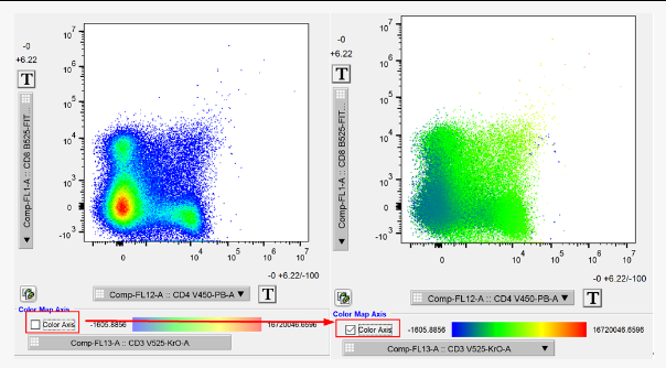那么什么是流式的降维分析?很简单,就是把多个荧光通道的实验结果及其相互关系展示在一张流式结果图上。其实flowjo本身最早的时候就支持3维降2维的常规分析,例如我们在flowjo的双参数散点图下方勾选第三个通道,第三个通道就会以颜色热力的方式展示出来: