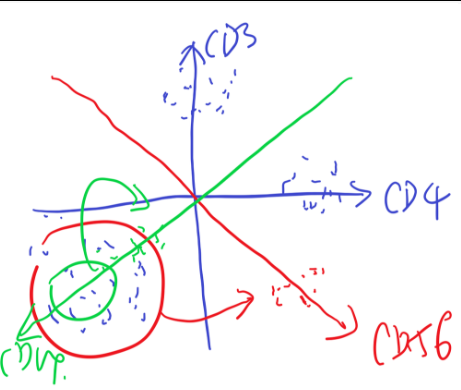 那么如果呈现更高,更多参数的维度到一张纸上呢?其实就是将这些荧光通道的信息通过电脑的整合,重新排布在一张散点图上即可。